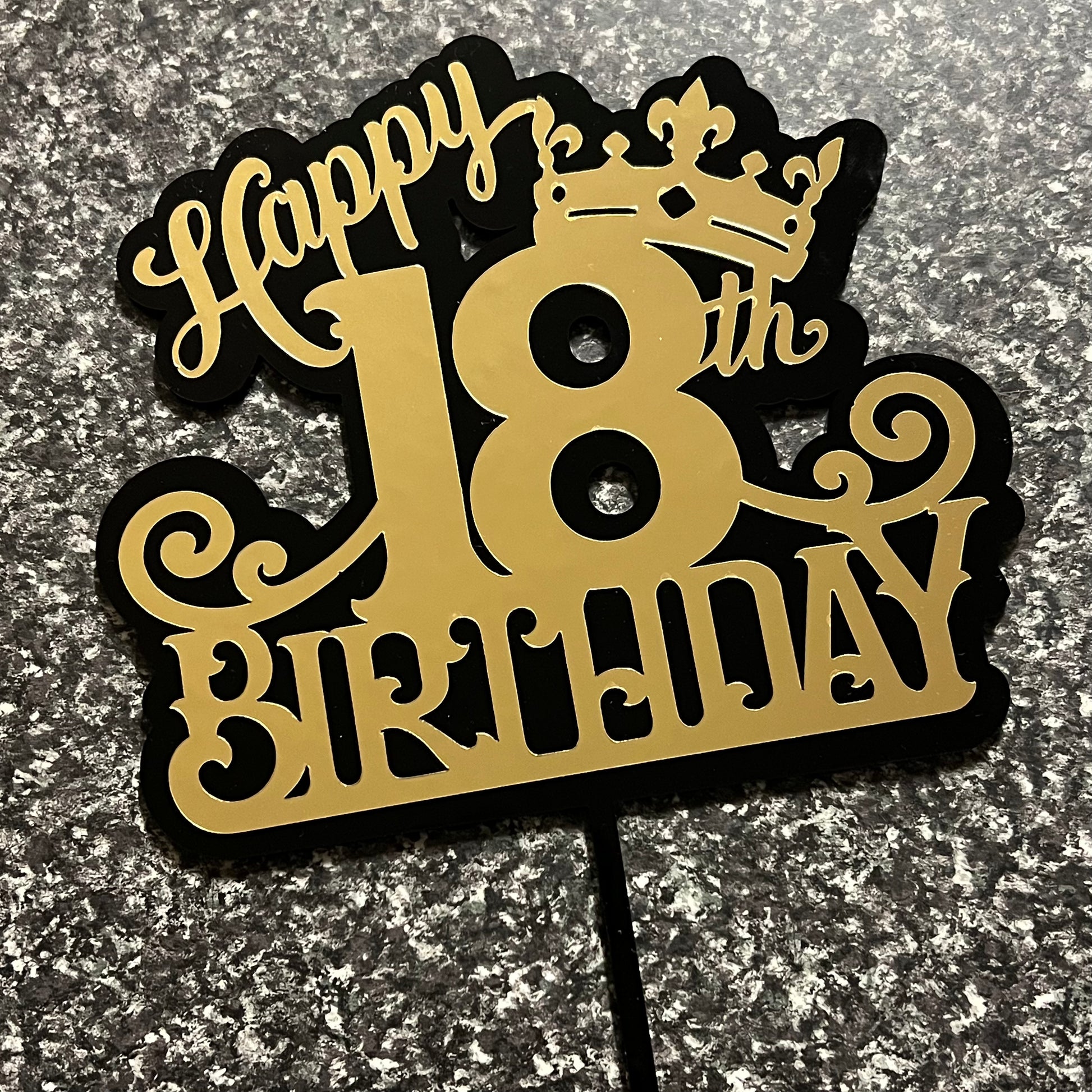 This cake topper is made with premium black and gold acrylic. You can personalised this item using different designs or by adding names.