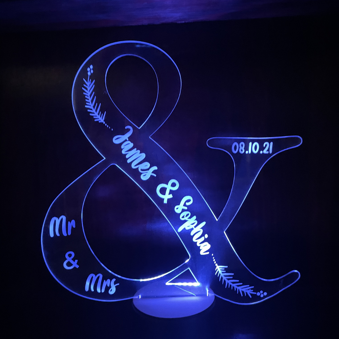 Made of clear acrylic engraved and cut, this LED lamp feautures a traditional AND sign, cut to portrays the love and commitment of the couple. The design allows the LED light to light up this beautiful design completely.