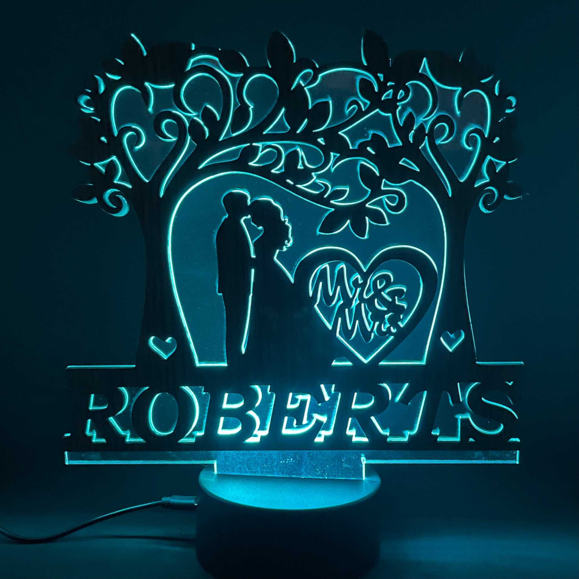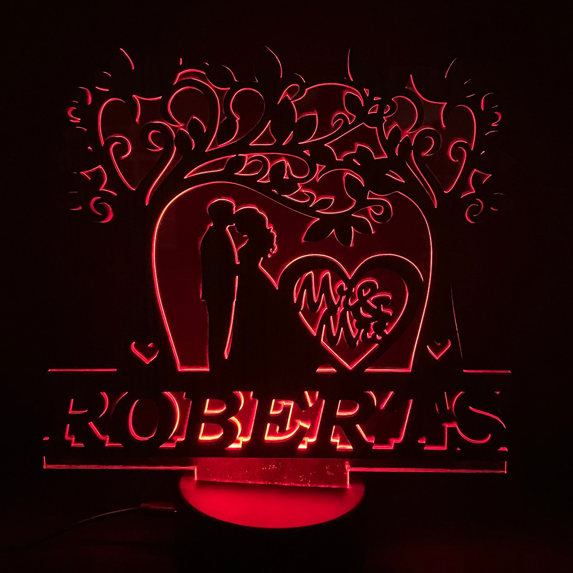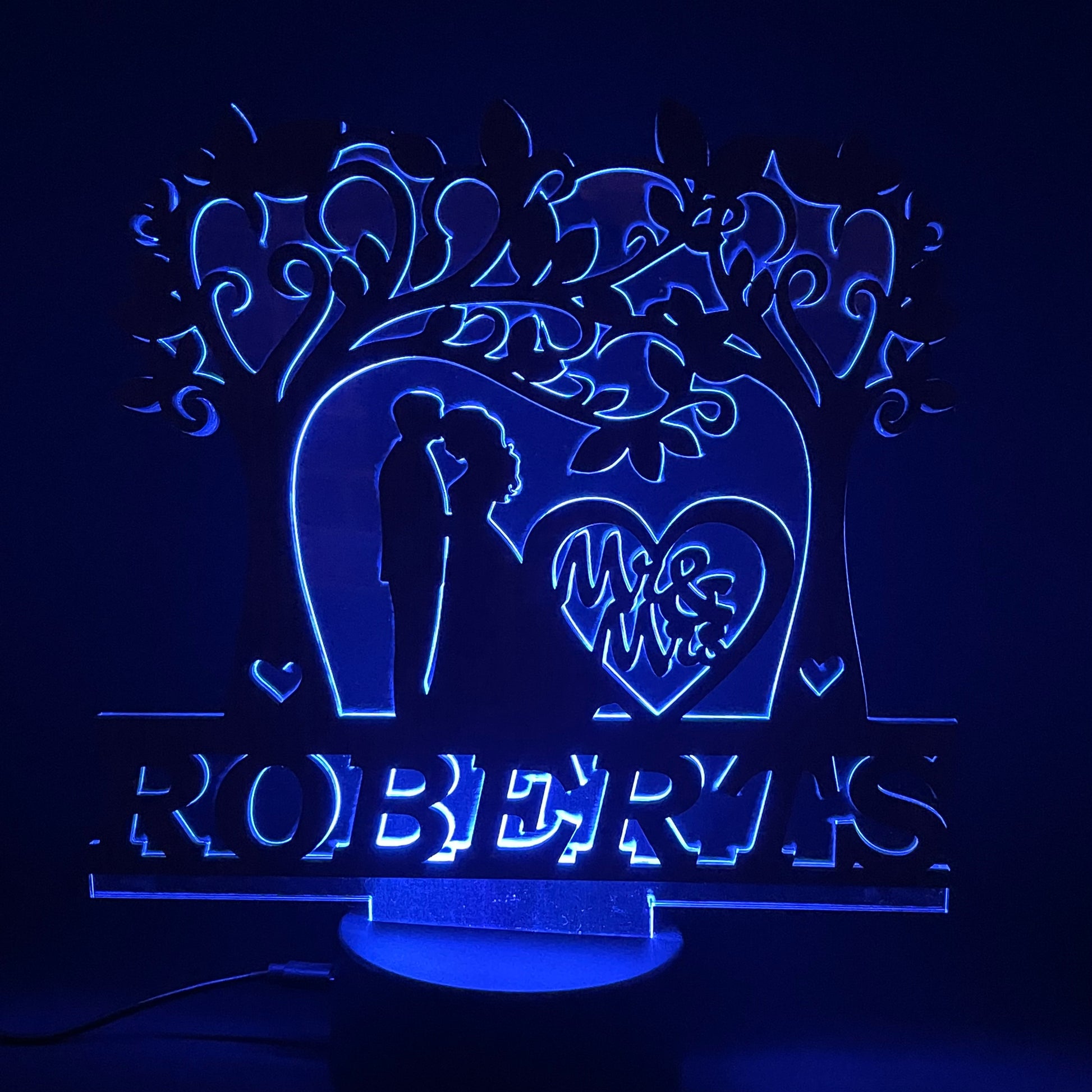 Made of premium clear acrylic engraved and cut to order, this LED lamp feautures a beautiful tree with a love couple and the family name underneath.