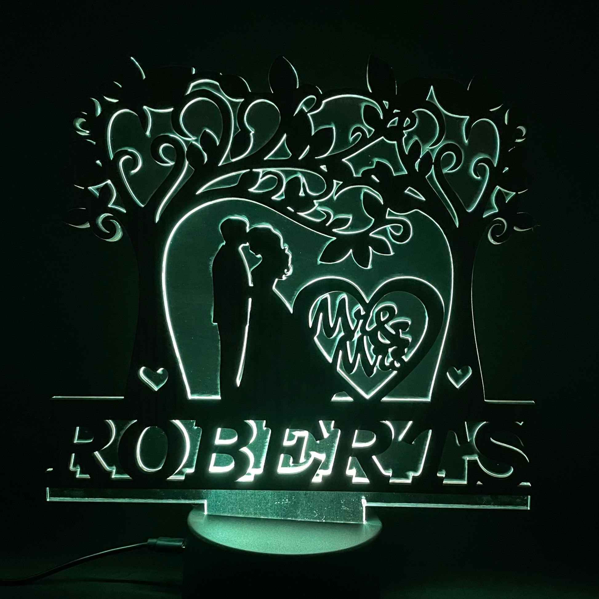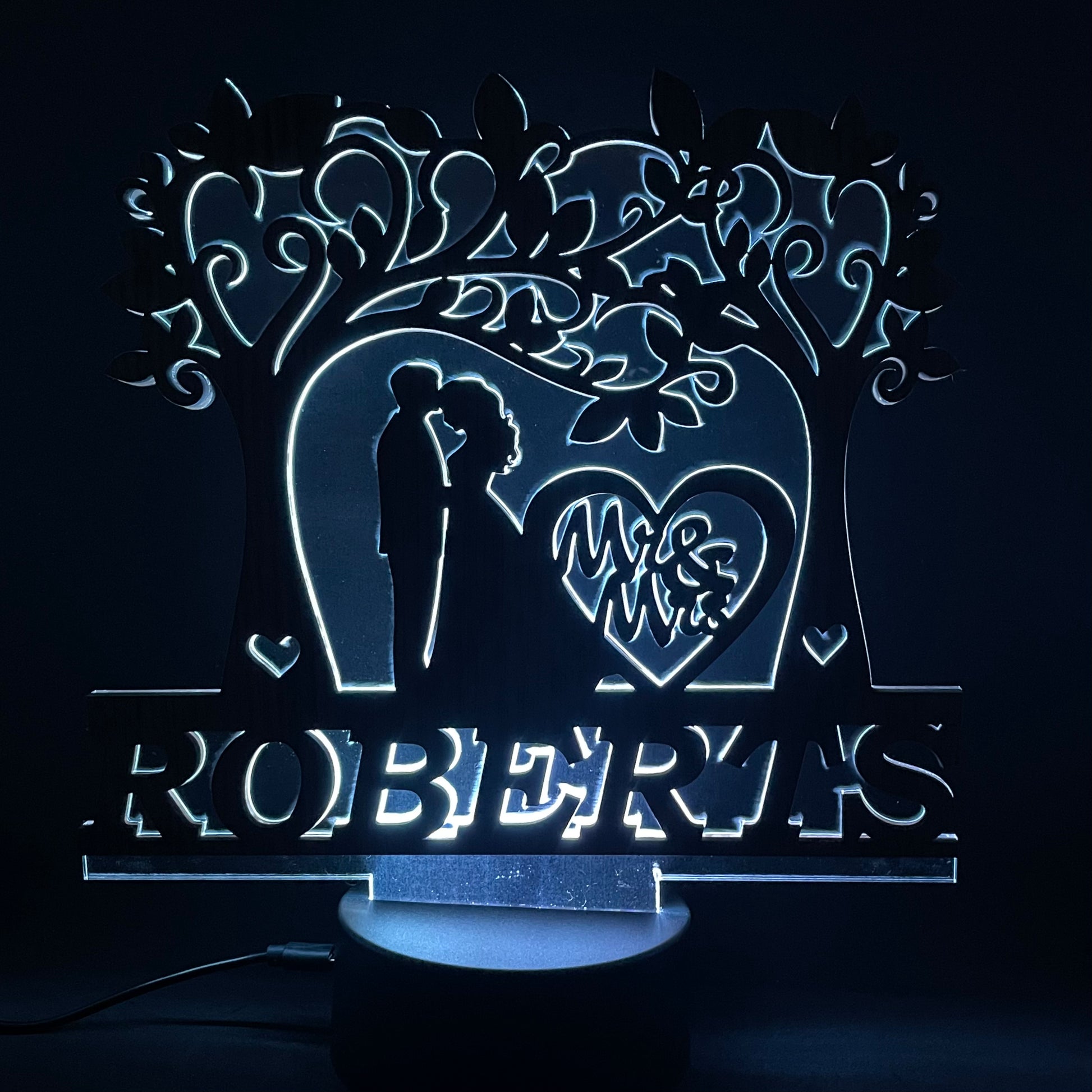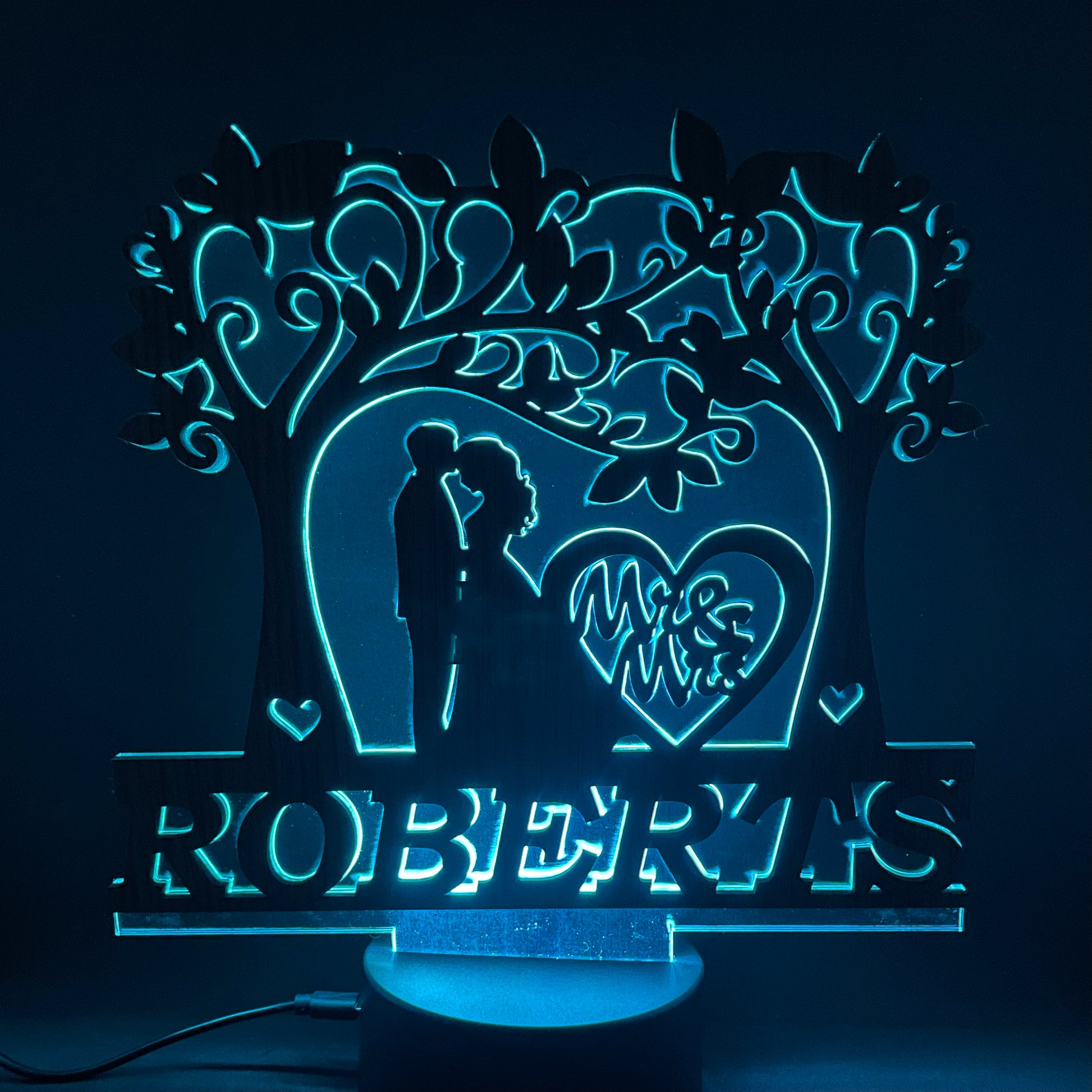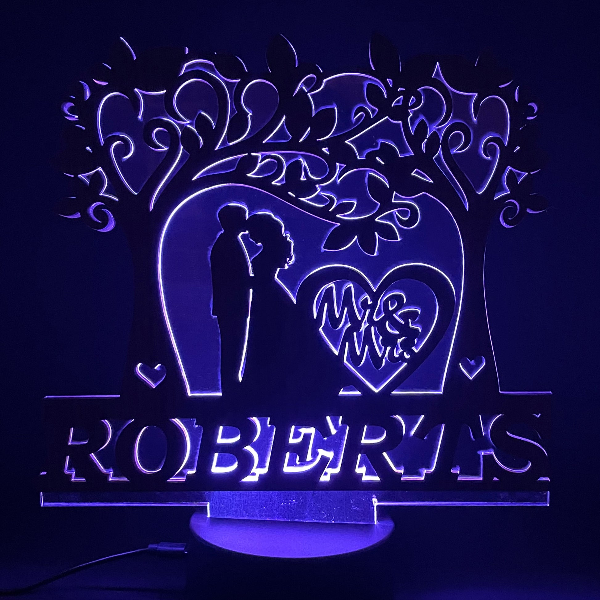 Made of premium clear acrylic engraved and cut to order, this LED lamp feautures a beautiful tree with a love couple and the family name underneath.