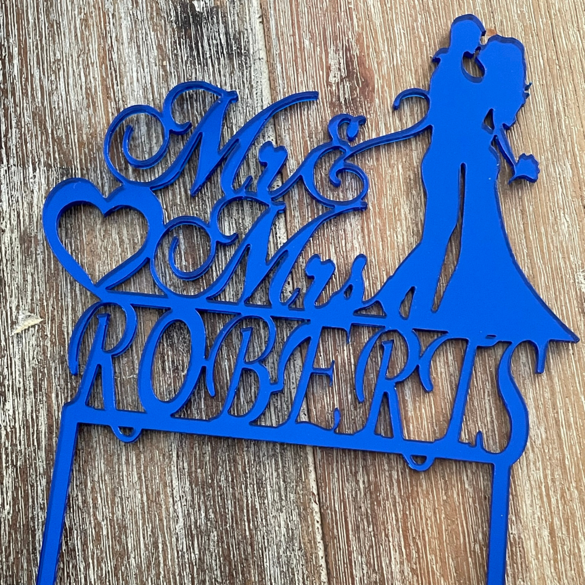 Made of a beautiful metallic blue acrylic 3 mm this cake topper is just perfect. It features a unique Mr and Mrs titles with surname and a couple on a bike! You can change the titles to suit the people getting married, either Mrs and Mrs or Mr and Mr.