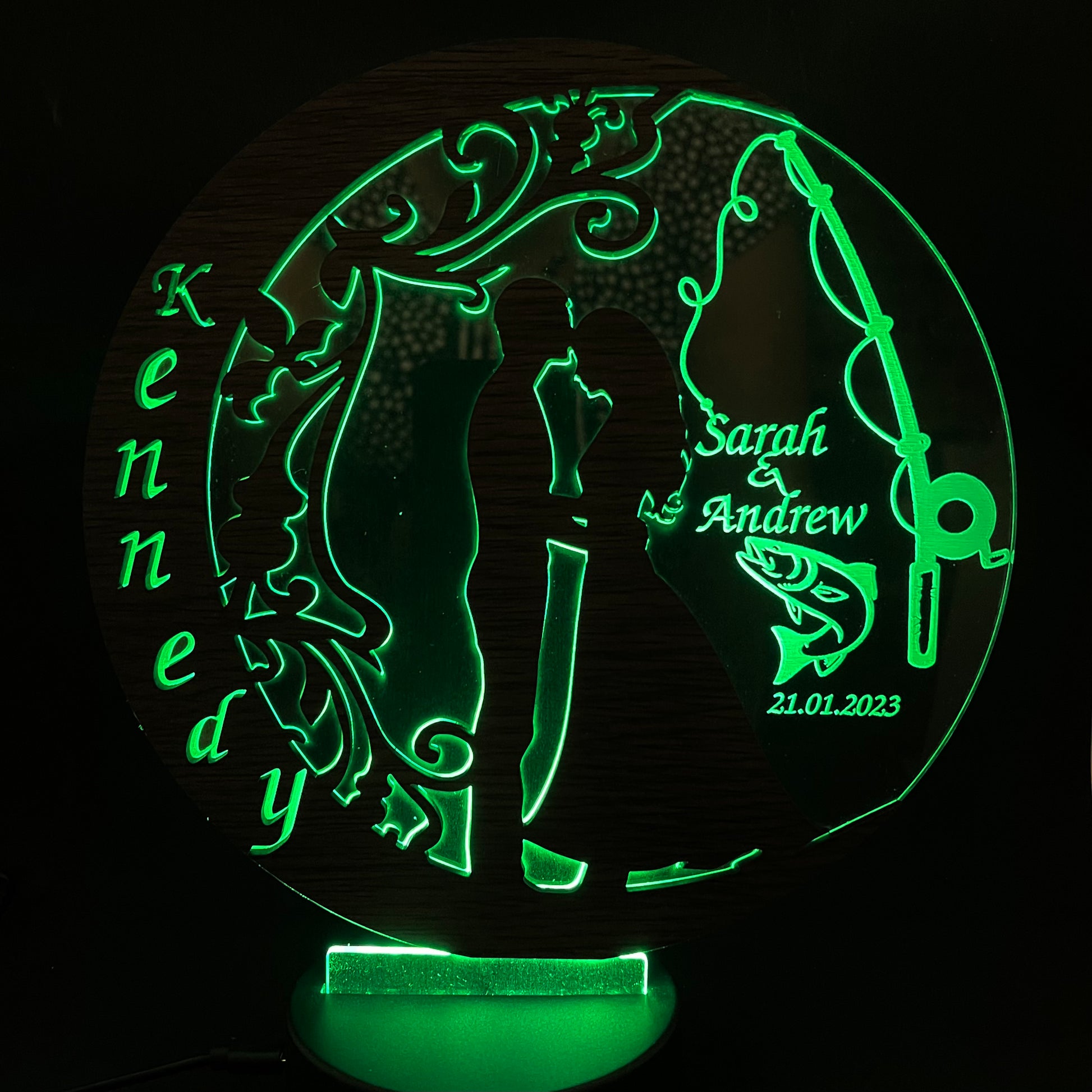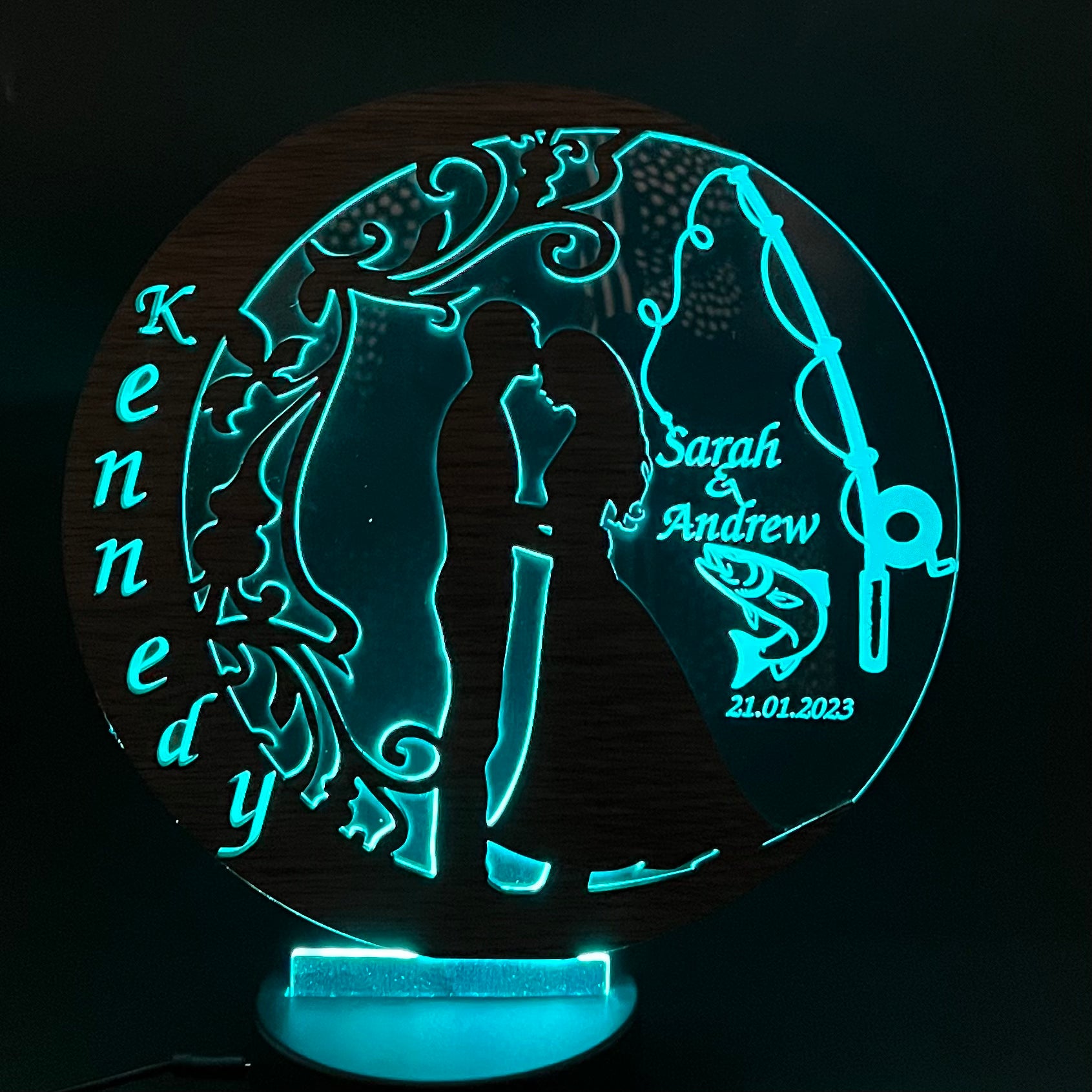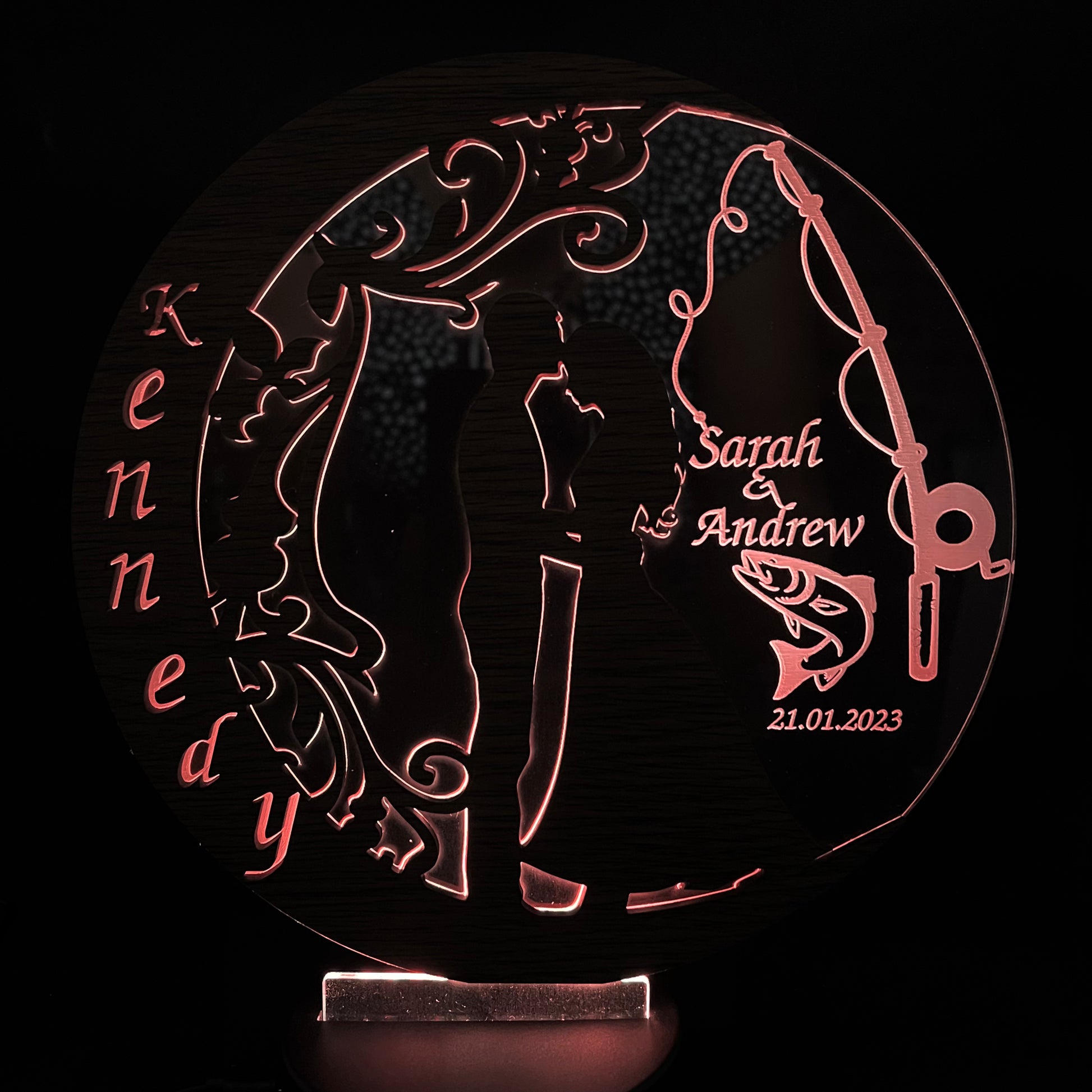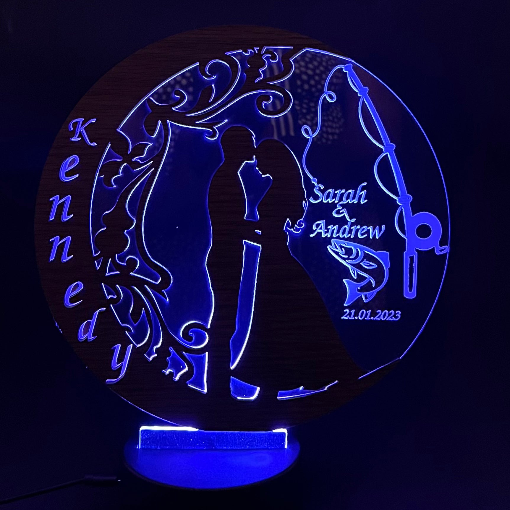 Made of premium clear acrylic engraved and cut to order, this LED lamp feautures a beautiful couple and the Moon engraved with their names, surname engraved to the side, and their special date.